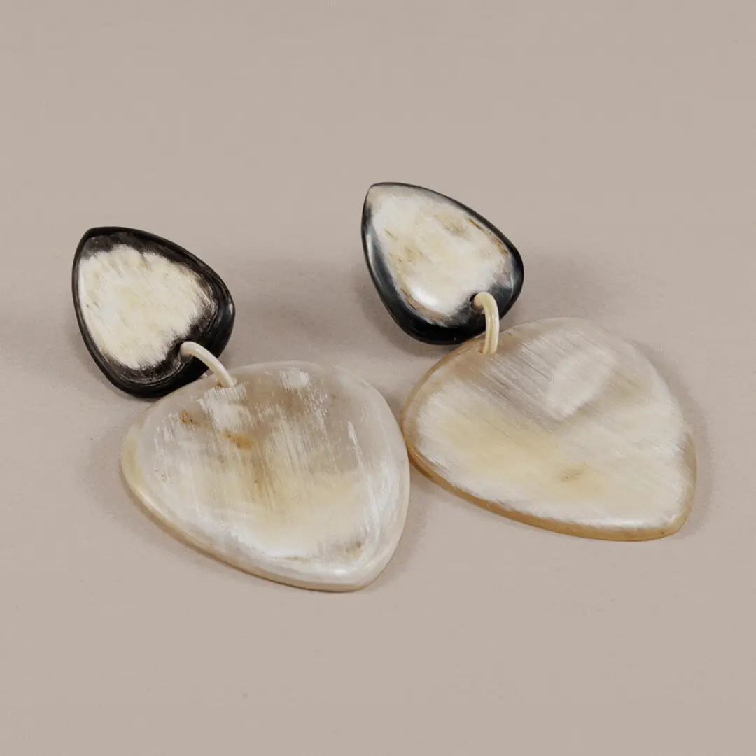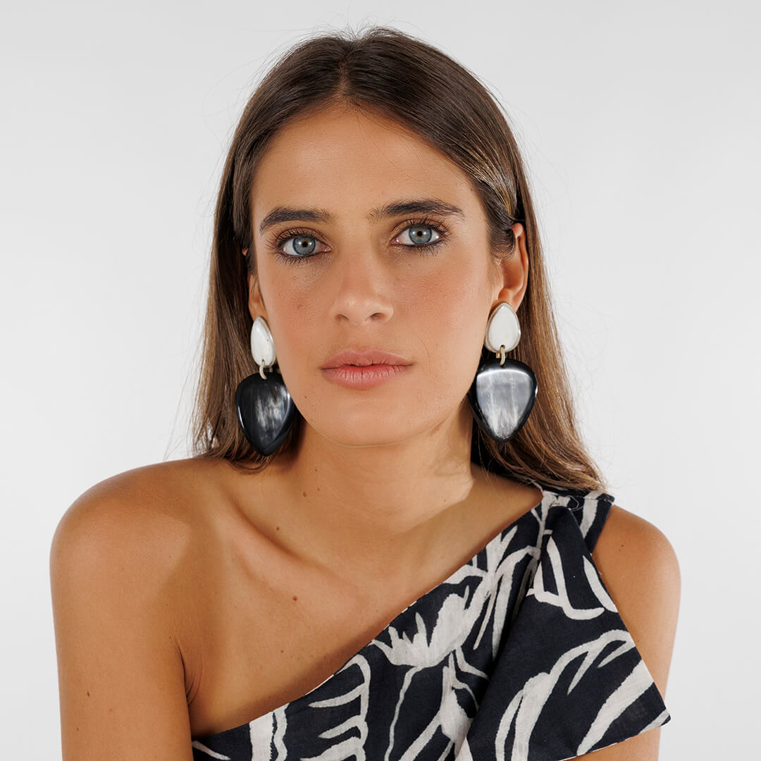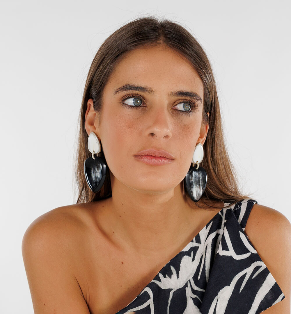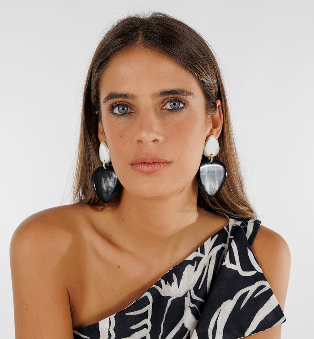 Los Pendientes Rigoberta están hechos en Italia con cuerno de búfalo natural. A pesar de su tamaño, no pesan nada y resultan comodísimos. Su diseño combina dos piezas en forma de lágrima en tonos blanco y negro, una mezcla elegante que encaja con cualquier look. Forman parte de la Colección Duality, una cápsula que celebra el equilibrio entre opuestos. Perfectos para un look de invitada o para dar un toque sofisticado a un estilismo más casual.