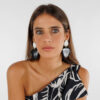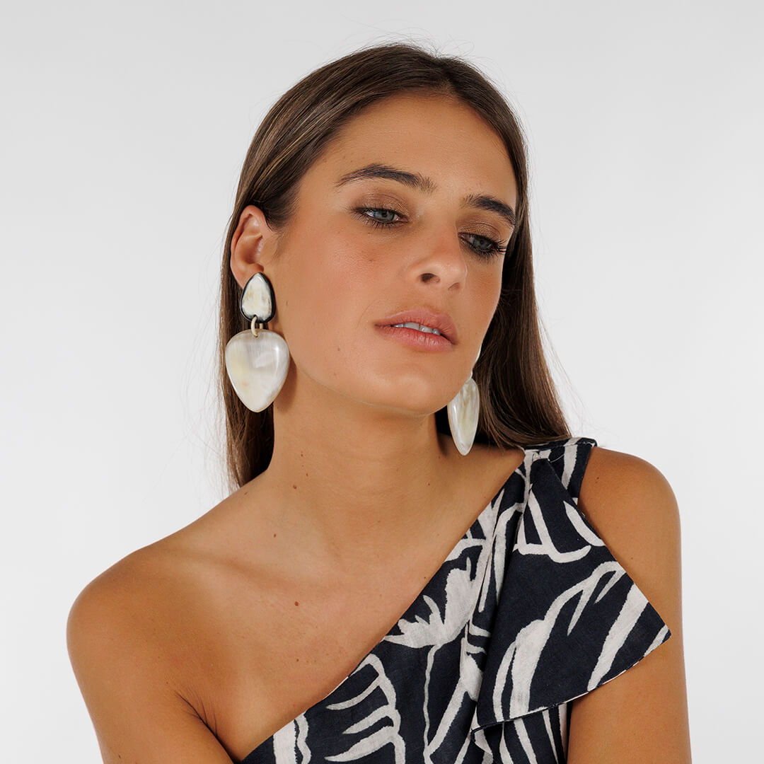Su diseño combina dos piezas en forma de lágrima unidas por una pequeña anilla. La parte superior es más pequeña y la inferior tiene una silueta más amplia, lo que estiliza el rostro y aporta movimiento. Están disponibles en dos combinaciones de color: blanco y negro, un dúo clásico que siempre funciona.