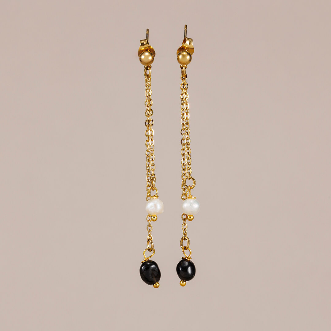 Pendientes Dual de doble cadena con perla de río y piedra de obsidiana. Diseño en acero inoxidable con baño en oro. Cierre de tornillo y peso ligero.