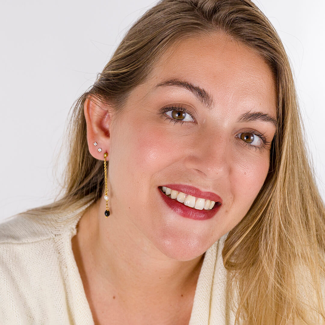 Los Pendientes Dual son tan versátiles que funcionan con cualquier look. Carlota, nuestra modelo, los lleva en un conjunto más arreglado con un choker de perlas, ideal para eventos o cenas especiales. Mientras que Marta, nuestra Boss, los luce en su día a día con un look más casual, demostrando que también encajan perfectamente en un estilo relajado.