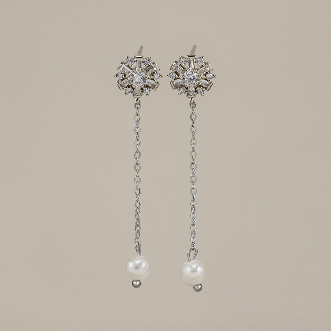 De la pieza principal cuelga una finísima cadena de eslabones, que aporta movimiento y ligereza, terminando en una pequeña perla de río blanca que añade ese toque clásico y sofisticado que nunca falla.