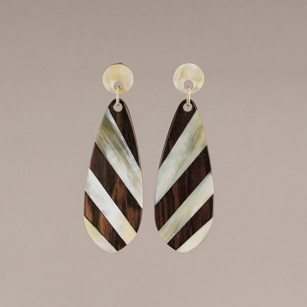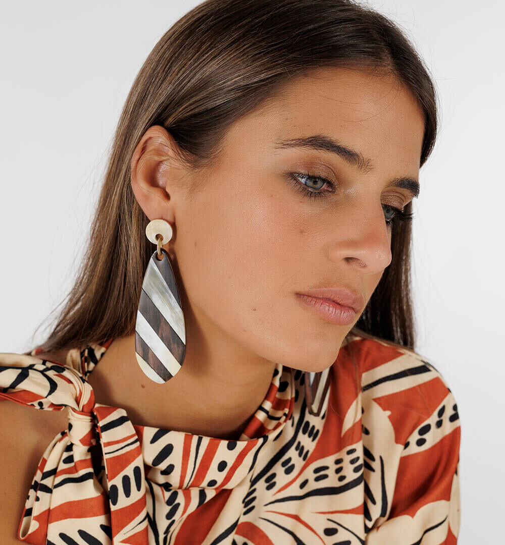 Los Pendientes Splendido son una de esas piezas que no necesitan presentación. Hechos en Italia con cuerno de búfalo natural, destacan por su forma alargada y su diseño en franjas diagonales que mezclan tonos oscuros y claros, consiguiendo un contraste súper elegante. Cada pendiente es único, con esas pequeñas vetas y matices que solo el cuerno auténtico puede tener.