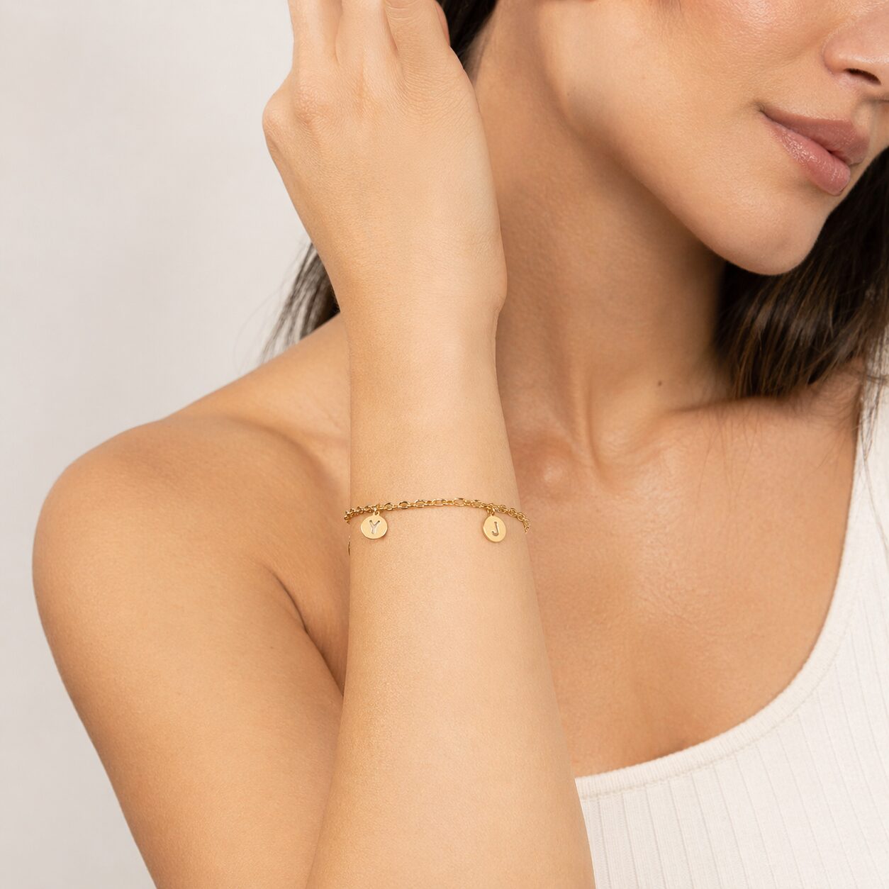 Esta pulsera está formada por una cadena de eslabones de estilo actual, acompañada de dos chapas grabadas con las iniciales que tú elijas. Es una pieza versátil y muy favorecedora, ideal tanto para el día a día como para ocasiones especiales.